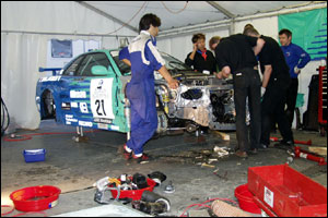 日産勢では、#44GT-Rが夜のうちにエンジンを積み替え、午後からの走行に備えている状態。夜に駆動系のトラブルが発生した#22GT-R(R33)は、現在21周遅れの134位。夜中2時前の時点で38位を走行していた#21GT-Rは、オールドコースへ入って間もなくの位置をギュンナー・ハーマンが走行中、前を走行していたBMWとホンダが接触、ホンダがコースアウトして跳ね返ったところへ時速160km以上のスピードで避けきれずクラッシュした。車両は2時間ほどかけてオフィシャルの手によりピットへ戻されたが、フロントを大破しており、現在、テントで修復中(156位)。