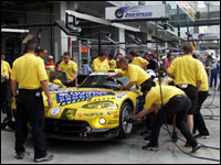 ニュルブルクリンク24時間レースも、3/4を終了。ニュルはお昼を迎えつつある。天気は相変わらずの薄曇りで、日差しがあるときは蒸し暑く、日がかげると涼しい。コースを走る車両のほとんどは、どこかを凹ませていたりテープの補修後があったりと満身創痍。そんな中で総合優勝争いは#33バイパーと#1ポルシェに絞られつつある。2台の差は98周を終了してわずかに48秒で、ピット作業でワンミスを犯したりコースアウトを喫するだけで、簡単に順位が変わるような不安定なもの。3位につけていた#3 ポルシェはクラッシュして順位を落としている。