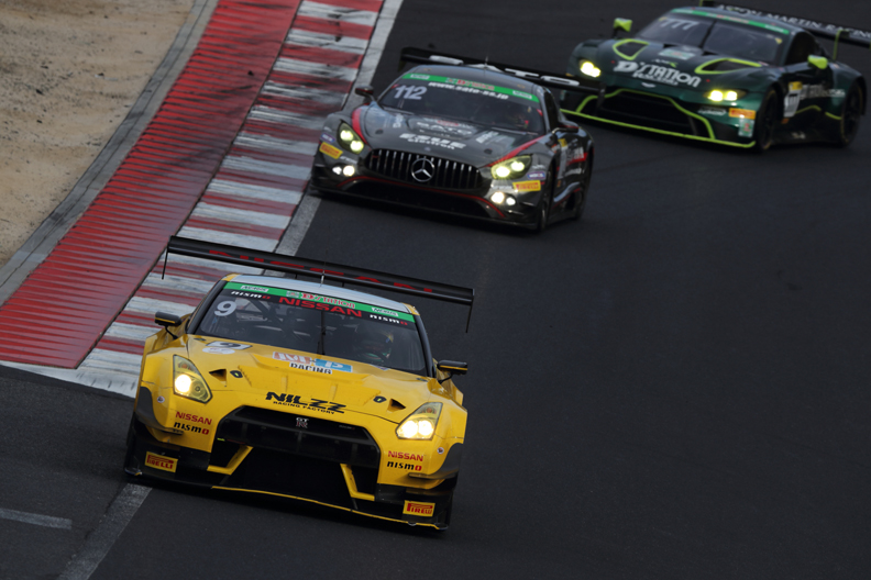 Group 1の決勝3時間レースは、10日の13時33分に33台がスタート。#1 GT-Rは浜野、#9 GT-Rは柴田がスタートを担当した。#9 GT-Rはオープニングラップで3位を奪うと5周目には#1 GT-Rをかわして2位に浮上。トップの#777 アストンマーティン・バンテージが42周で最初のピットインをすると、#9 GT-Rがトップを奪い46周でピットイン。#1 GT-Rは早めの25周で最初のピットインを済ませ星野に交代し、47周目には2位に浮上した。