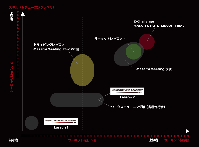 NISMO大森ファクトリーが主催しているサーキットレッスン、大森ファクトリーとの提携イベントであるMasami Meetingのポジショニングイメージです。