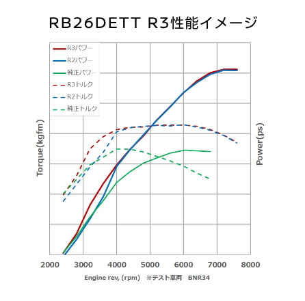 排気量を変えることなく中低回転のトルク不足を改善したR3は、RB26オリジナルの性能を残しつつ、更なる進化を楽しみたいお客さまにお勧めです。